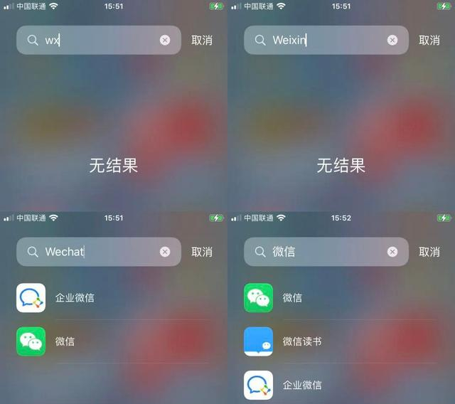 按照国人的习惯,从搜索通讯录中人名到搜索 APP 名称,使用每个字的首字母或者拼音搜索显然是更高效的方式,而 APP 资源库中似乎并不支持模糊搜索功能。以微信举例,用中文拼音首字母「wx」和全拼「weixin」竟然都显示「无结果」,符合其逻辑的搜索应该是「wechat」或者「微信」。