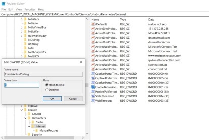 · 导航到 “ HKEY_LOCAL_MACHINE \ SYSTEM \ CurrentControlSet \ Services \ NlaSvc \ Parameters \ Internet”