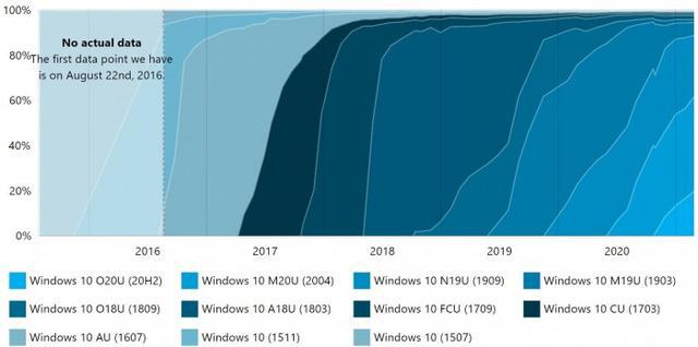从过去几年的数据趋势来看,20H2版本明显比过去的版本花了稍长的时间来扩大市场份额,但这并不是一个巨大的差异。在未来几个月21H1版本发布之前,它应该会继续稳定增长。