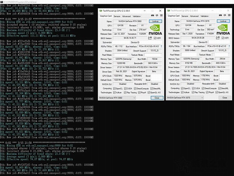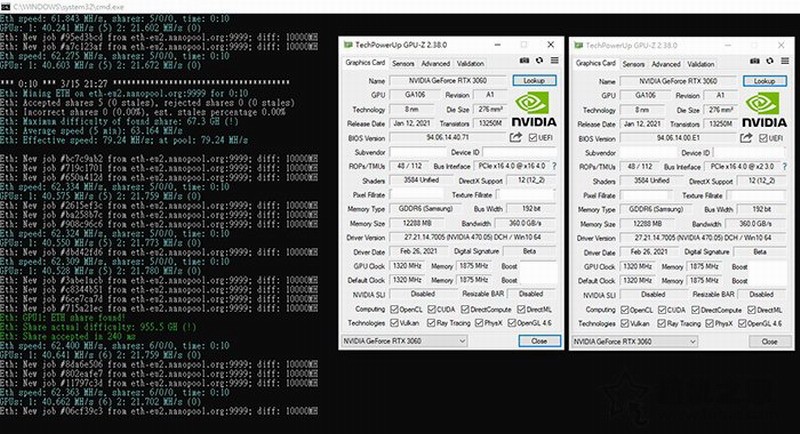 此外外媒还测试了2块不同显卡,分别是RTX3060和RTX3070,如果RTX3060插到第一个插槽,RTX3070插到第二个插槽之后,这两块显卡均可以正常挖矿,但是将两块显卡调换插槽插入,由RTX3070输出画面依然会受到限制,可能原因是必须搭配全速的PCIe x16通道,如果是这样的话,那RTX3060多卡挖矿限制依然无法破解,因为矿机基本是PCI-E X1转X16转接器。