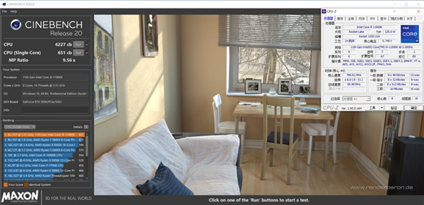 i9-11900K在CineBench R20中也跑出了非常逆天的分数,651cb比起i9-10900K高了20%,同时也强于所有的Zen3处理器。