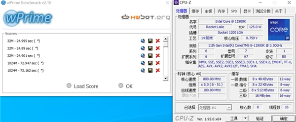 在wPrime 32M单线程测试中,i9-11900K仅用了24.9秒就跑完了测试,相比市面上其他处理器的优势都在10%以上。