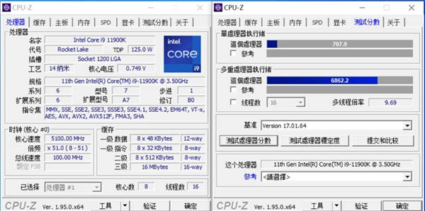 i9-11900K单核分数达到了708分,是目前为止最高的成绩;多核分数也有6862,比锐龙7 5800X略高3%。