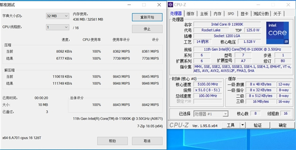 在7-zip的测试中,i9-11900K的单核性能也是最强,比i9-10900K提升了6%,多核心反而领先5%。