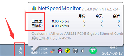 NetSpeedMonitor小巧,使用简单,以后观测网络流量就不用再使用体积臃肿的360安全卫士了。NetSpeedMonitor的观测情况一目了然,U和D分别表示上传、下载速度,非常直观。