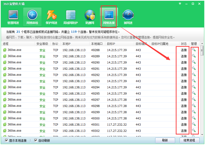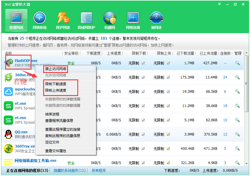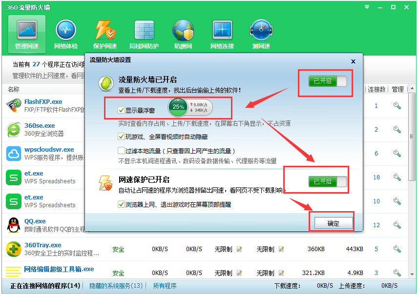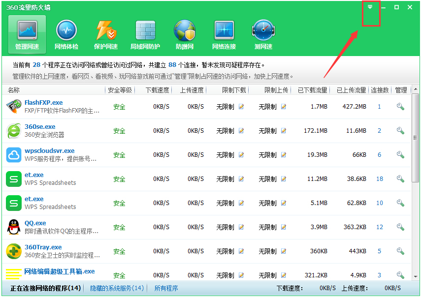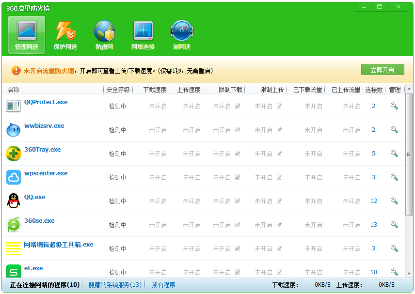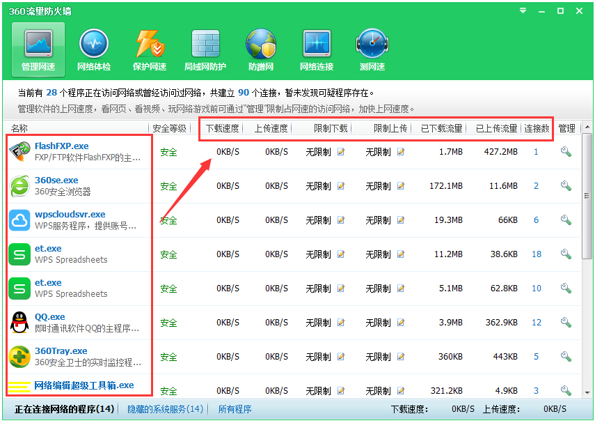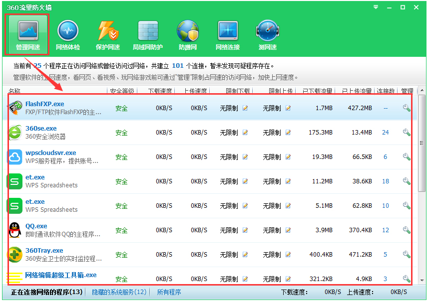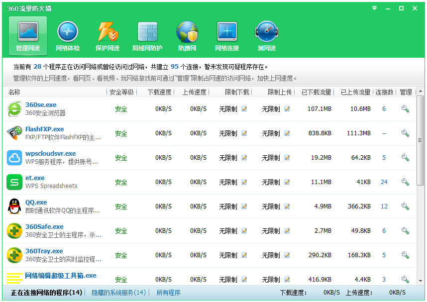 360流量防火墙能够限制本机下载速度,查看正在使用网络的程序,显示程序的下载速度和上传速度,已下载的流量及上传的流量,程序的网络连接数。