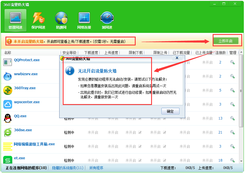 如果你已经装了360安全卫士,那么绿色版独立版的360流量防火墙就无法开启流量防火墙
