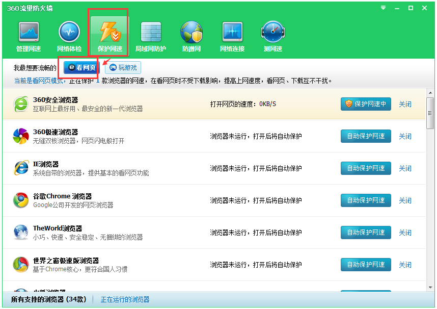 5.开启网速保护,自动让占网速的程序为浏览器预留出网速,看网页不受下载影响。
