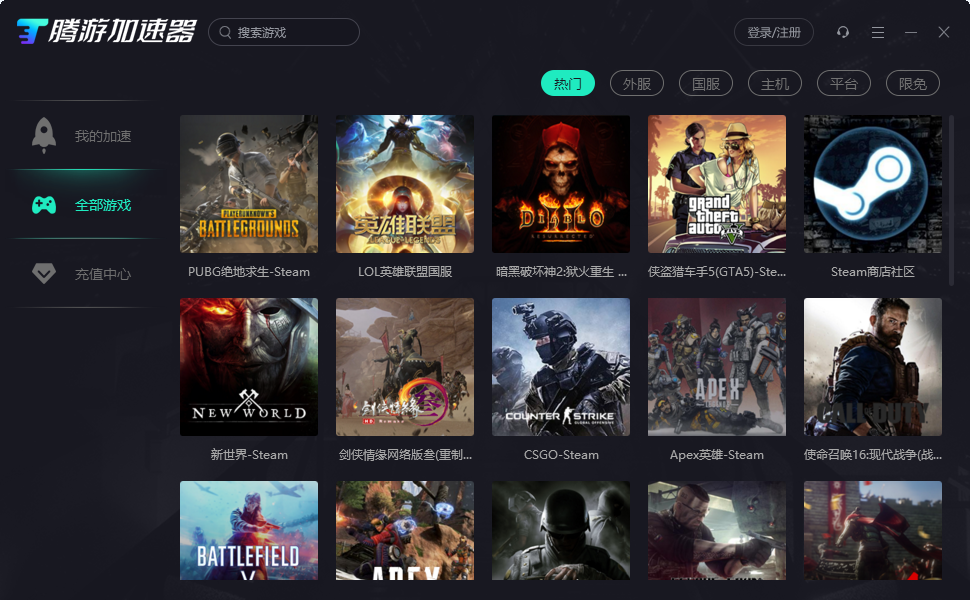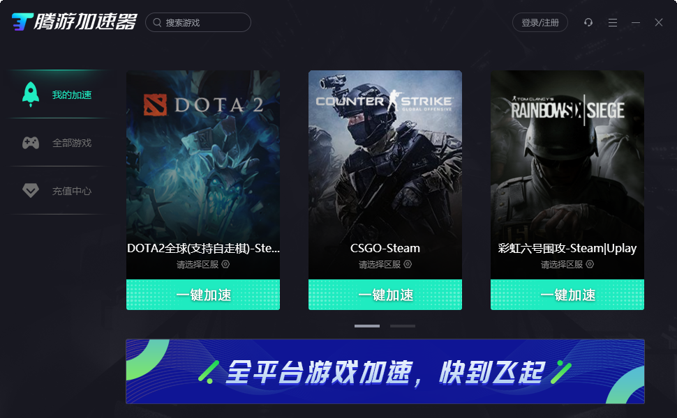 腾游加速器能够有效帮助游戏玩家解决网游延时高引起的登录难、易掉线、卡机等问题。支持国内外海量热门游戏:PUBG(绝地求生)、DOTA2、CSGO、Apex、失落的方舟、永劫无间、彩虹6号、战地5等千款游戏。全球游戏,极速畅玩,支持全部国服\外服游戏加速、低延迟、无丢包。新用户手机登录可免费试用,一键加速,不用可暂停。
