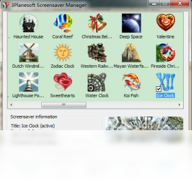 Ice Clock 3D 屏幕保护程序的3D效果非常逼真,也非常漂亮,可以用冷艳美来形容。冰冷的水面上浮着12块冰块,每块冰块代表一个整点,有序地排成一个圆形,显示着当前的时间。你可以设置为屏幕静止10分钟后启动屏保,当电脑10分钟没有任何动作后,你的屏幕就变成一个由冰块制成的时钟了。