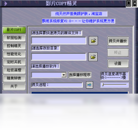 影片COPY精灵是一个免费软件,CDROM或DVDROM只要完成把文件拷贝到硬盘的任务就可以休息,实现了保护功能。此外软件还提供软驱检测功能,可以用来校准磁头和清洁磁头,还有定时关机功能、系统优化、清除硬盘垃圾文件功能、杀灭浏览器广告功能、程序管理功能、随意隐藏功能(可用它保护私隐)。