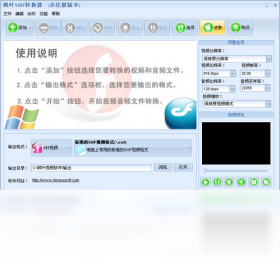 枫叶SWF转换器是一款功能强大、操作简单的SWF视频转换工具。使用SWF转换器可以帮助您将几乎所有流行的视频格式视频文件转换为SWF视频格式。也可以帮助您将SWF视频转换为其它的流行视频格式。整个视频转换过程极为简单、并且转换快速极快,视频转换质量极高。同时支持批量转换,支持视频预览,可以同时转换多个文件。