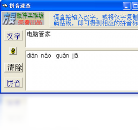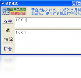 在《拼音速查》文字框中输入汉字,或在其它软件中将汉字复制到剪贴板,马上即可得到带音调的标准拼音标注。新版本对拼音库作了一点小小改动,将原先的数字标注(如:ren2之类)改为标准的拼音音调标注。