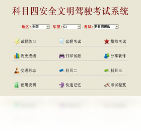 科目四安全文明驾驶考试系统软件采用的是公安部“2013最新题库”并且软件中的“考试题库”“考试界面”“考试流程”和正式考试都完全相同,让你能预先知道考试的情况而不慌乱。另外科目四安全文明驾驶考试系统软件功能强大,可以让你在最短的时间内掌握考试题库,并最终通过正式考试。本软件适用各类机动车驾驶人员科目一科目四理论模拟考试。系统适用车型:1.小型车(C1、C2、C3、C4、C5)。2.客车类(A1、A3、B1)。3.货车类(A2、B2)。4.轮式自行机械车(M)。5.摩托车(D、E、F)。6.恢复驾驶员资格考试(满12分考试)。
