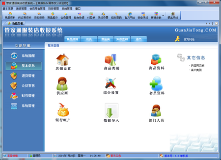 管家通服装店收银系统是专门针对服装店,内衣,鞋帽店而设计的收银软件, 是一款最具有市场潜力的服装收银软件,结构明晰,操作简单,对店铺商品的进销存能很好地管理,让你的经营帐目清清楚楚。独创的颜色尺码处理技术,可以轻松应对各种颜色尺码。适用对象服装内衣鞋帽、小规模的个体工商户。