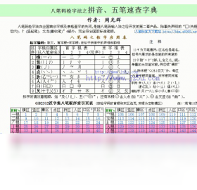 八笔码检字法在全国首创字根及表格查字的先河,是继八笔码输入法之后开发的第二套产品。本字典用鼠标往页表中一点,即可直接查字;只要笔顺标准,没有查不到的字;学会了查字,也就学会了八笔码打字(检字码+拼音头)。本电子书不用安装,暂时提供GB2312汉字集拼音的一个读音和86版五笔的一个全码。