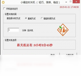 小福定时关机是一款界面简单,易于操作的定时关机软件。本软件提供二种定时关机模式:递减模式和指定时间模式。软件默认为递减关机模式,在此模式下用户只需要输入距离需要关机的时间(分钟),在倒计时的0分钟后即执行关机操作。