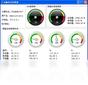电脑状况监视器主要有电脑CPU使用率仪表盘、内存使用率仪表盘、硬盘使用率仪表盘、实时捕捉电脑资源使用状况等功能。
