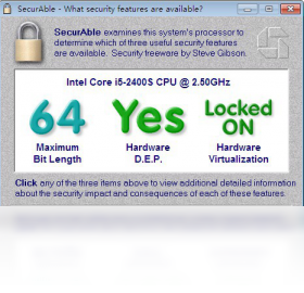 securable能够测试CPU能否支持Windows7的XP模式, 看来Windows 7 中的免费的小赠品还不是谁都可以吃的。按照Engadget的说法,如果你安装了Windows7的专业版或者旗舰版,并且想使用其中的XP兼容模式(XPM),你的计算机必须达到两点要求:内存不小于2G并且CPU支持硬件级虚拟模式,内存就不用说了,那么怎么知道你的CPU是否支持这个模式呢?试试securable吧。