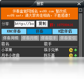 一款歌曲伴奏软件。10万首优质带歌词立体声原版伴奏,9万首高品质KSC伴奏以及歌词,在线收藏夹功能,无论何时何地轻松调出自己的伴奏,伴奏播放历史记录功能,在线播放的同时自动下载到您指定的目录,多进程高速下载模式,以最快的速度完成伴奏下载,各种伴奏以及歌手排行,让您及时了解最新最热的伴奏,更加人性化地音轨切换功能,适合家庭K歌、网络K歌。