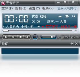 天音听听是一款炫酷的免费的音乐欣赏与娱乐软件。它采用与系统紧密集成且极其稳定的Windows Media Player作为音乐播放内核。软件内带超过14万余首完整的歌曲列表,采用互联网上海量的音乐资源,连接时优秀的算法保证您能以最快的连接速度在软件中直接收听到您所选择的任意一首歌曲。