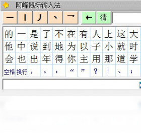 阿峰鼠标输入法是一款直接用鼠标来打字的软件;只要点击鼠标就可以打字,不用学习,只要会写字就可打出汉字。使用很简单,只要看一眼就会打,跟手机笔画打字一样。适用于小孩,老人,以及拼音不好的朋友使用。