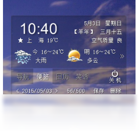 棒棒桌面V1.0是一款完全透明的桌面日历。在不影响用户桌面美观的前提下,我们力图提供给用户基本的天气、日历查询、便捷桌面搜索等服务。同时,棒棒会在此基础上,进一步开发基于融合用户桌面系统的日历服务产品。