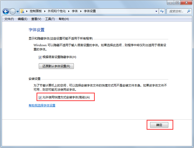 2、点击左侧的“字体设置”,打开字体设置窗口,在“安装设置”选项中勾选“允许使用快捷方式安装字体(高级)”选项,点击“确定”按钮。
