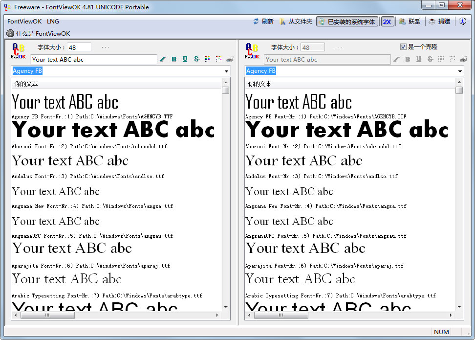 FontViewOK是一个字体浏览的小软件,可以直接输入文本预览,也可以选择打印预览,还可以自行设置大小,粗细,斜体和颜色。制作浏览已经足够用了。