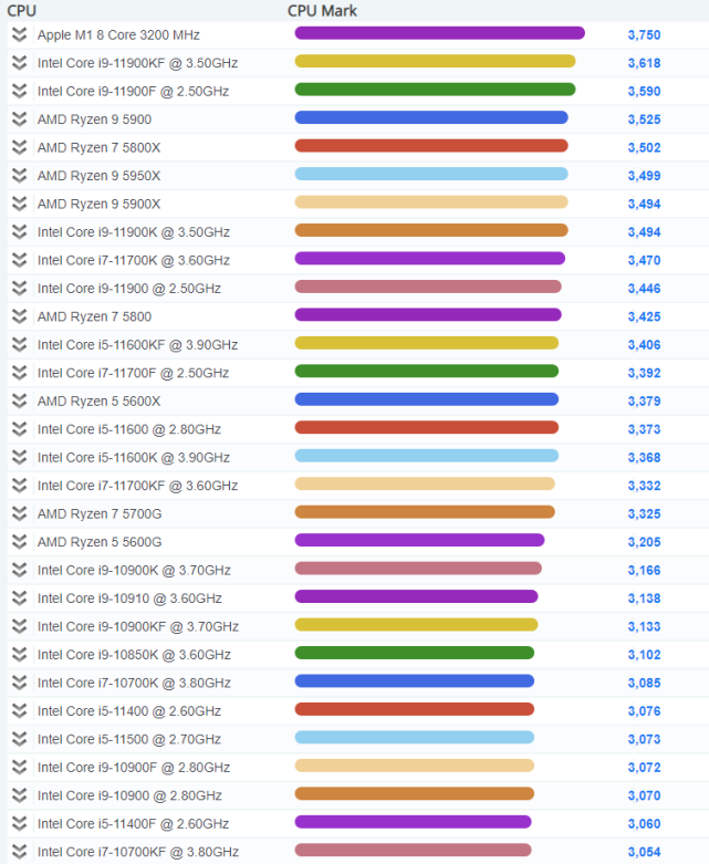 看上图可知,苹果的M1芯片竟然排在了首位,第1名,单核性能竟然超过intel最新的第11代酷睿的旗舰i9 11900KF,后者可是一颗将近6000元的旗舰cpu啊!