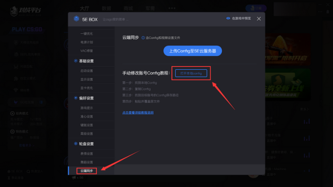 还原CSGO游戏cfg文件文件,打开5E对战平台客户端,点击左下方”5EBOX“ - ”云端同步“ - ”打开本地config“,删除掉”cfg“文件夹。