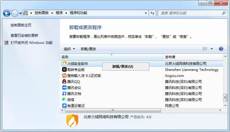 步骤2、打开控制面板-程序-卸载程序,找到“火绒安全软件”,右键点“卸载“,如下图
