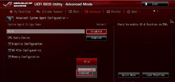 3、在打开的System Agent Configuration窗口中,找到VT-D选项,并将选项状态修改为Enabled。