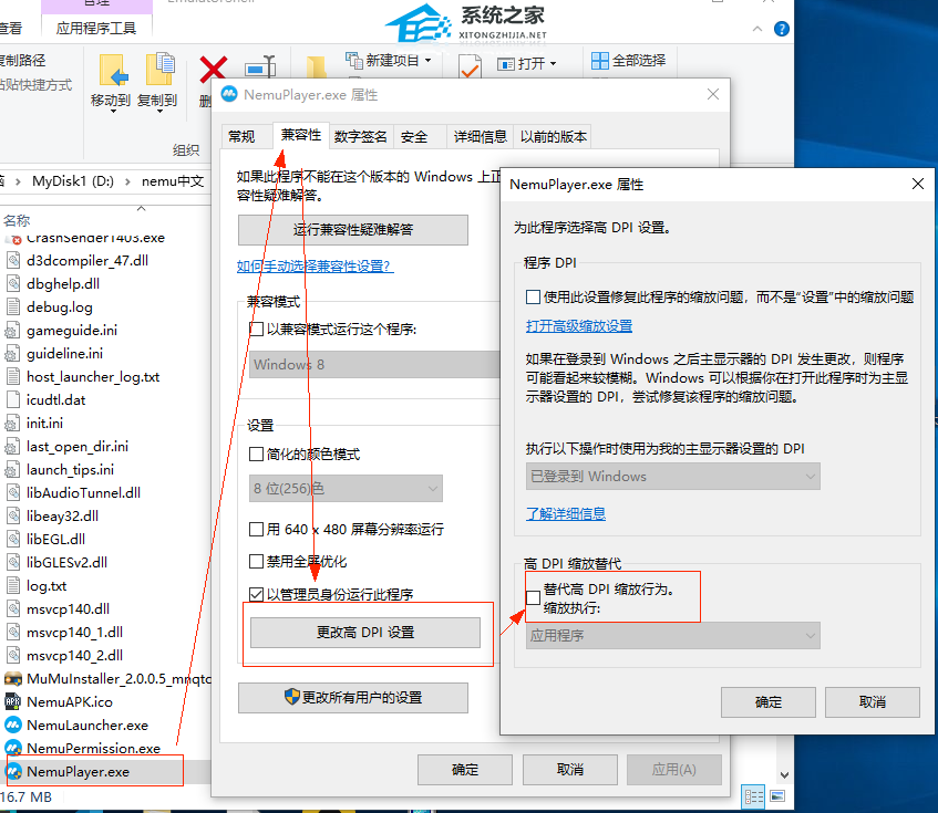 情况三,在电脑桌面右键点击MuMu模拟器图标,属性一兼容性一更改搞DPI设置一取消勾选高DPI缩放行为后保存,重启模拟器。