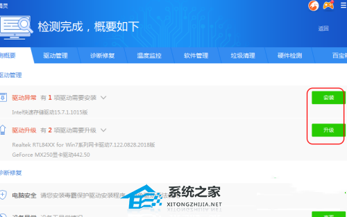 3、下方会显示需要升级的驱动,点击相应品牌显卡后的“升级”下载。下载成功之后点击“安装”,最后重启设备即可。