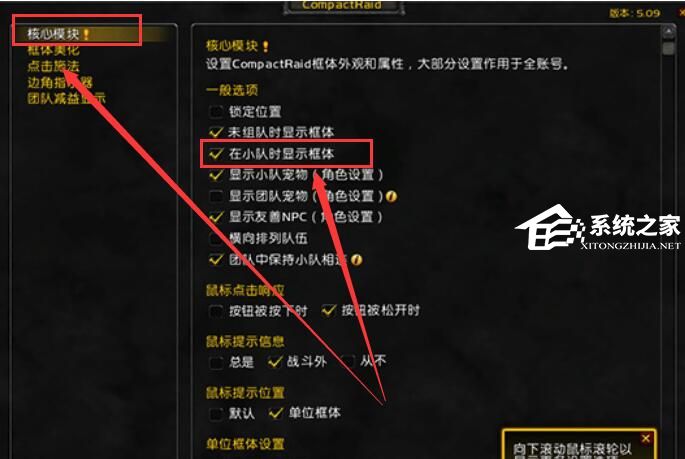 3、然后在“核心模块”中,将“在小队时显示框体”,取消勾选,就能进行设置了。