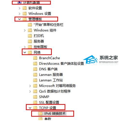 2、打开“计算机配置—>管理模板—>网络—>TCPIP设置—>IPv6转换技术”。