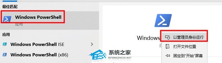 1、使用搜索功能——找到powershell——右击windows powershell——选择以管理员身份运行。