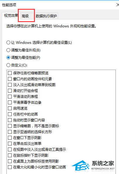 4、这次出现的是性能选项,左键点击高级选项卡。