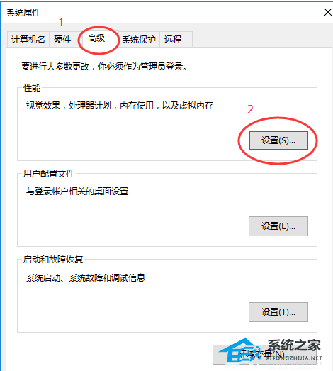 3、然后会弹出系统属性,先点击高级选项卡,再左键点击设置按钮。
