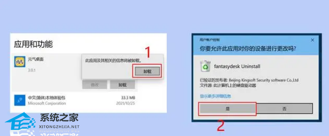 3、系统会弹出确认窗口,这里需要依次点击“卸载”、“是”,然后系统将启动“元气桌面”的卸载程序。