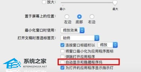 5、最后取消“自动显示和隐藏程序坞”并确定保存就能还原了。