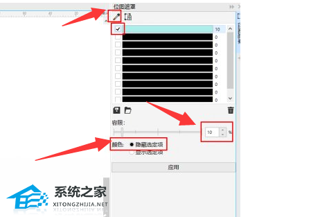 3、使用吸管工具吸取背景颜色,选择隐藏选定向,将容限值调整为10左右,点击应用就可以将背景颜色去掉了,那么剩下的就是剩下的图形了。