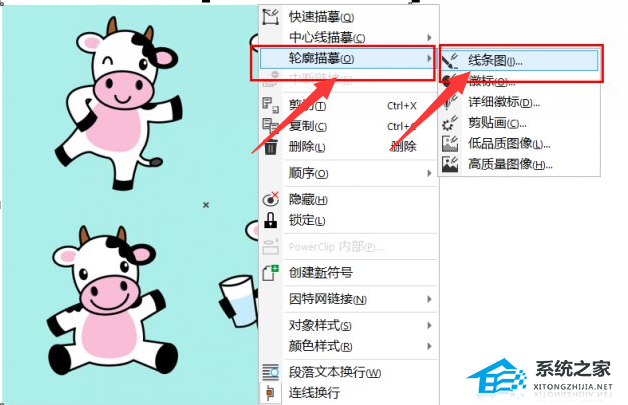 2、选中图片,右键单击出现窗口,选择“轮廓描摹”—“线条图”。
