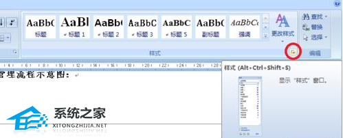 1、在word2007样式功能区的右下角位置,有一个小图标,位置如图中圆圈圈出的位置,鼠标移动到那个位置上的时候会有一个小的预览窗体,就是要弹出的窗体的预览啦,而鼠标点击一下会弹出一个样式窗体。这里,我们要点击一下,弹出这个窗体来。