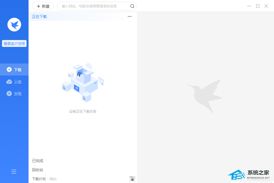 启动后默认为下载栏,整体界面分为了三栏模式,左侧一栏为功能分类栏,中间为主功能区域,右侧为信息显示区域。原本在一启动就会在内容显示区域出现一大片的广告及推荐内容,到了迅雷11中已经改变了这种设计,新版中已经默认为了下载信息显示区域不再显示推荐内容,这样一来,它就显得比较的简洁,没那么花俏了。不过目前它尚处于内测阶段,正式版到来时这种设计不知道有没有改动。
