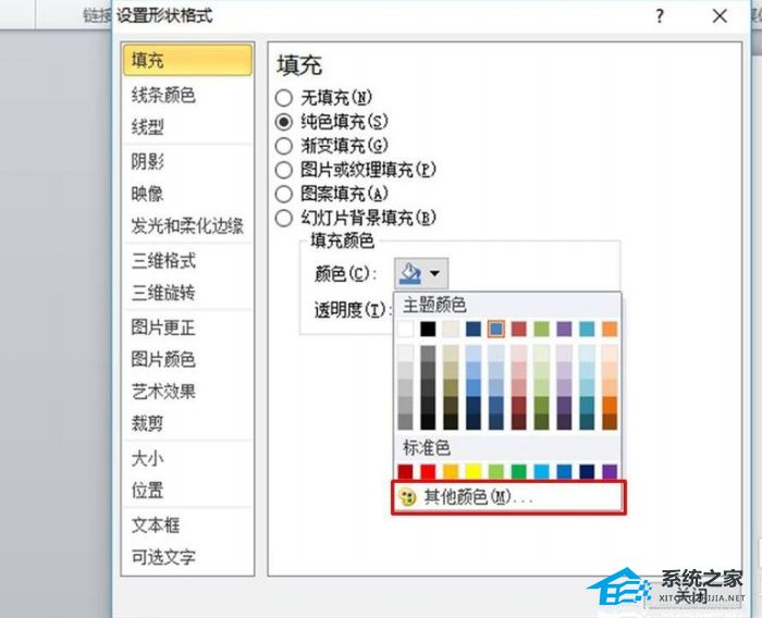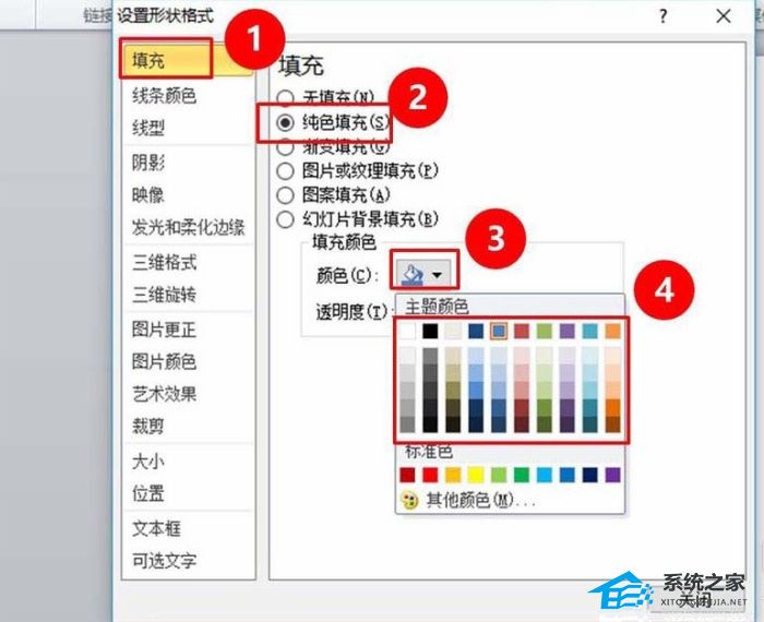 5、选择【填充】-【纯色填充】-【颜色】-【主题颜色】,在主题颜色中选择任意一种颜色,如果主题颜色中没有需要的,则进行下一步。