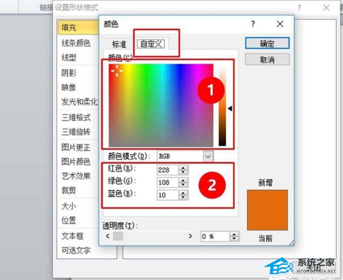 8、选择自定义这个选项卡,在图示1区域内直接选择你需要的颜色,图示1提供的颜色有1044种;或是在图示2区域内设置颜色的参数设置颜色,这种方法可以设置出16777216种颜色。