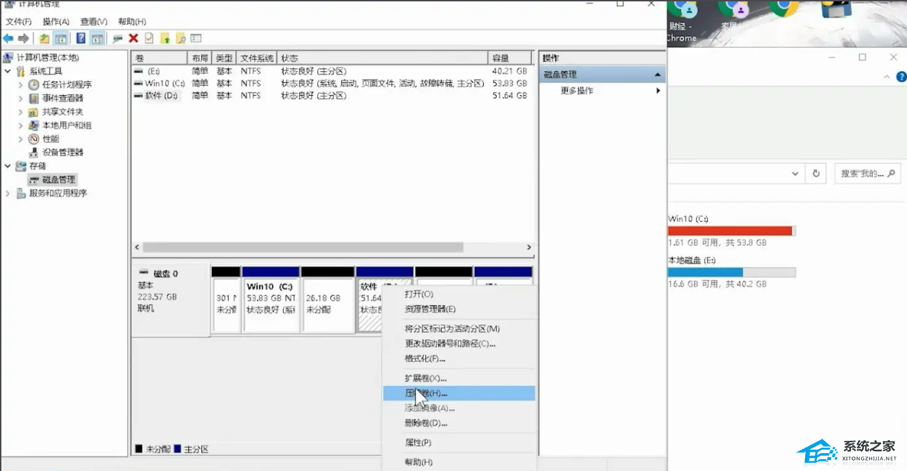 3、选择d盘需要的空间并点击压缩,压缩完成后,将d盘现在的文件转移到新的空间里。
