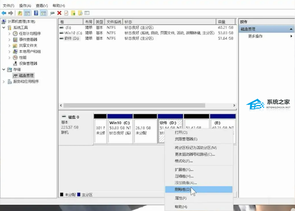 4、将D盘的文件转移后右键d盘,选择删除卷。
